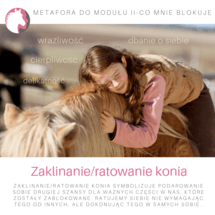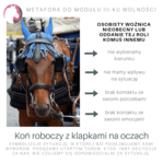 Konie stanowią jeden z najsilniejszych symboli. Kojarzą się nam z siłą, pięknem, ale też niebezpieczeństwem, ryzykiem. Prowadząc programy rozwojowe z końmi towarzyszę wielu osobom, którym obecność koni na świecie daje coś niezwykłego i które szukają z nimi kontaktu. Metafory związane z końmi są tak silne, że nawet po ich wysłuchaniu zaczniesz patrzeć na świat w inny sposób i .... działać.